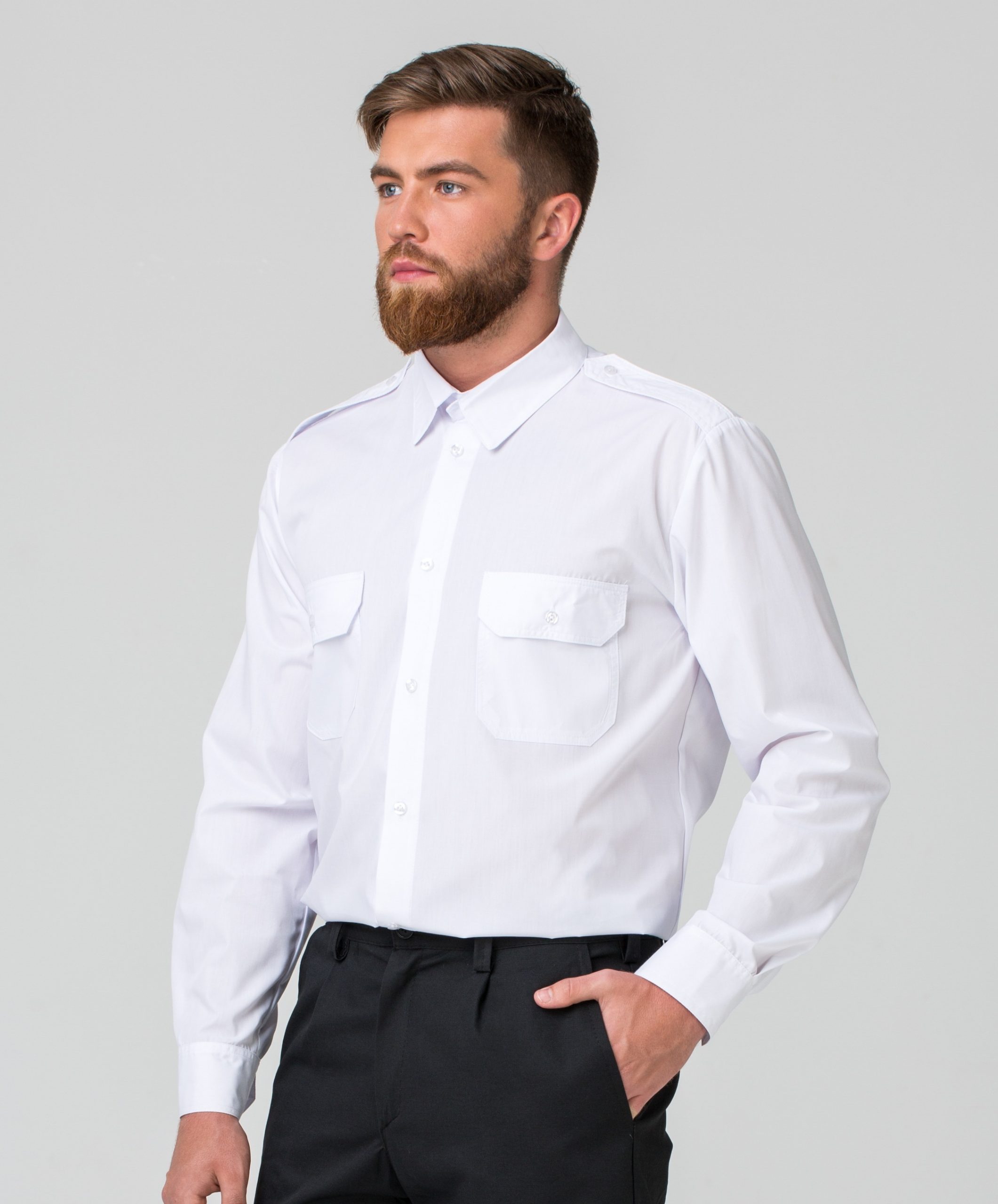 Сорочка прямого силуету, центральна застібка на ґудзики і петлі. Класичний відкладний комір на стійці. На поличках накладні кишені з клапанами, які застібаються на петлю і ґудзик. Спинка з кокеткою і двома складками. На плечах погони з петлею і ґудзиком. Рукава довгі, з манжетами на ґудзиках. Низ виробу фігурний.