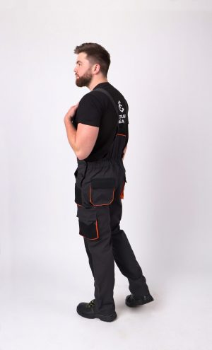 Нагрудник з накладною кишенею і клапаном на липучці. На передніх половинках брюк розташовані дві накладних бічні кишені, наколінники. З лівого боку накладна бічна кишеня з клапаном на липучці. На кишені настрочені додаткові кишені для інструментів.